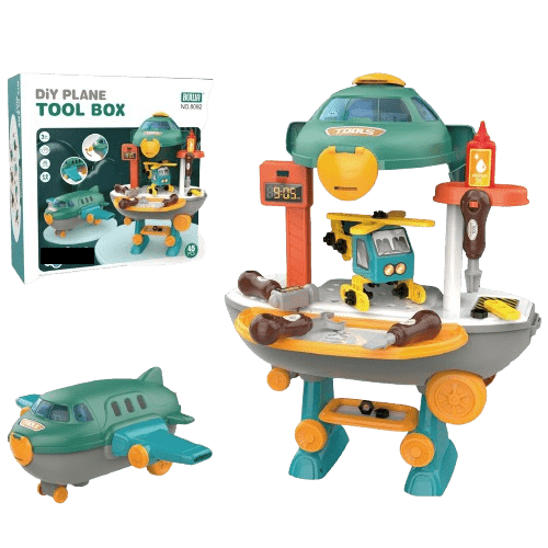 Παιχνίδι 2 σε 1.  Ένα αεροπλανάκι που μετατρέπεται σε πάγκο εργαλείων. Παράλληλα όταν κλείνει, μετατρέπεται σε κανονικό μεγάλο αεροπλάνο που κινείται. Περιέχει τουβλάκια και εργαλεία συναρμολόγησης, για να κατασκευάσει το παιδί ό,τι θέλει. Για ατέλειωτες ώρες παιχνιδιού.
