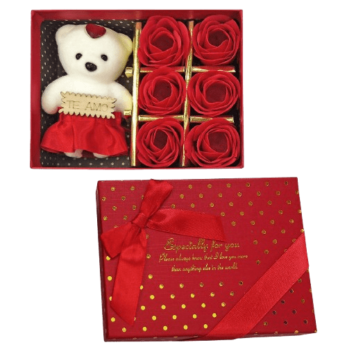 Δωροέκπληξη αγάπης! Ένα ολοκόκκινο  κουτί με μήνυμα χρυσοτυπίας. Περιέχει έξι ολοκόκκινα τριανταφυλλάκια διακοσμητικά και ένα χαριτωμένο αρκουδάκι αγάπης.