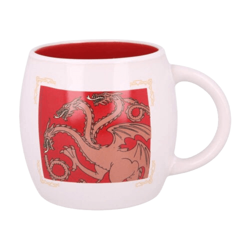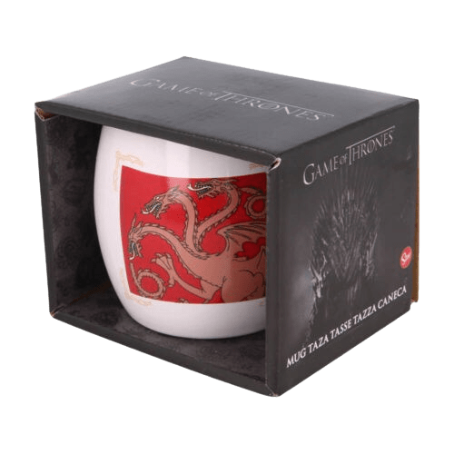 Κεραμική κούπα από την εμβληματική σειρά Game of Thrones, που απεικονίζει δράκους σε κόκκινο φόντο. Το εσωτερικό της είναι επίσης κόκκινο. Η κούπα έχει ειδικό σφαιρικό σχήμα και συνοδεύεται κουτί δώρου με τα λογότυπα της σειράς.