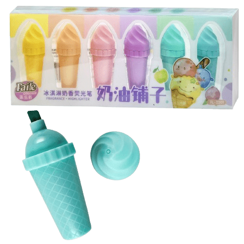 Σετ σε διάφανη συσκευασία με έξι μαρκαδόρους υπογράμμισης σε σχήμα παγωτό χωνάκι. Ένα πρωτότυπο και χαρούμενο σετ για να γίνει το διάβασμα διασκέδαση!