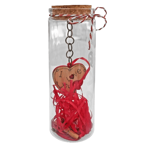 Μεγάλο γυάλινο μπουκαλάκι με φελλό που περιέχει ξύλινη κόκκινη καρδιά I love you, κρεμασμένη από το καπάκι και ρολάκια χαρτιού για γράψετε μηνύματα αγάπης και έρωτα στο αγαπημένο σας πρόσωπο. Κλείνει με φελλό και είναι στολισμένο με κορδελάκι κορδονιού σε άσπρο και κόκκινο.