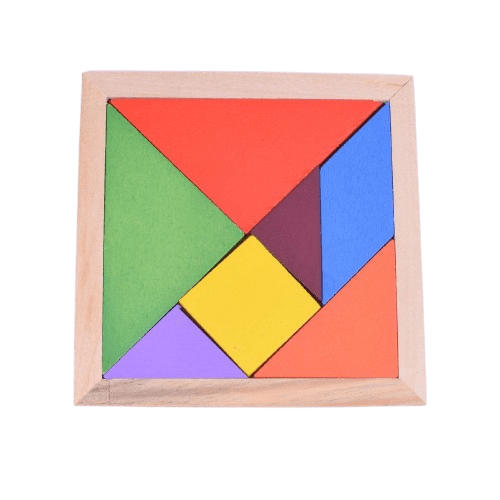 Ξύλινο Τάνγκραμ χειροποίητο με πολύχρωμα ξύλινα σχήματα που πρέπει να συνδυαστούν μεταξύ τους για να ολοκλρώσουν τον γρίφο.