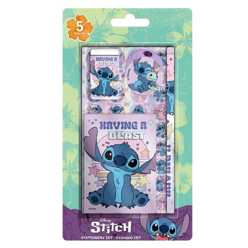 Σχολικό σετ με σημειωματάριο, μολύβι,  γόμα, ξύστρα και μία σελίδα με αυτοκόλητα από την αγαπημένη σειρά Lilo & Stitch. Ένα απαραίτητο σετ για τα παιδιά που θέλουν να ξεχωρίζουν στην τάξη!