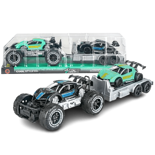 Δυναμικό όχημα με μεγάλες ρόδες και μηχανισμό friction που τραβάει τα βλέμματα. Έρχεται με ρυμούλκα που μεταφέρει ένα αγωνιστικό αυτοκίνητο, ιδανικό για γρήγορες ταχύτητες και περιπετειώδεις διαδρομές στο παιδικό δωμάτιο.