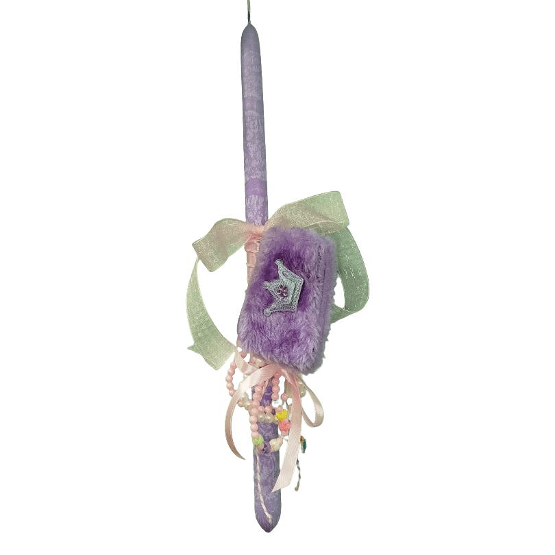 Αυτή η χειροποίητη πασχαλινή λαμπάδα είναι ένα αληθινό όνειρο για κάθε μικρή πριγκίπισσα. Το λιλά κερί με την ιδιαίτερη τεχτροπία είναι διακοσμημένο με δύο εντυπωσιακούς φιόγκους οργάντζας. Το κεντρικό διακοσμητικό είναι ένα πανέμορφο, χνουδωτό πορτοφολάκι μπρελόκ σε μωβ χρώμα με ένα κεντημένο ασημί στέμμα. Επιπλέον, συνοδεύεται από χαριτωμένα βραχιολάκια με χάντρες και charms μονόκερου και πεταλούδας, έτοιμο να φορεθεί.