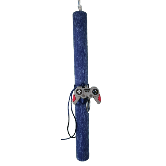 Η απόλυτη λαμπάδα για τους νοσταλγούς των κλασικών βιντεοπαιχνιδιών! Ξεχωρίζει αμέσως χάρη στο μοναδικό μπρελόκ σε σχήμα ρετρό χειριστηρίου, φέρνοντας αναμνήσεις από ατελείωτες ώρες gaming. Ο σχεδιασμός ολοκληρώνεται υπέροχα πάνω σε ένα σκούρο μπλε ανάγλυφο αρωματικό κερί, με διακριτικό δέσιμο που αφήνει το διακοσμητικό στοιχείο να πρωταγωνιστήσει.