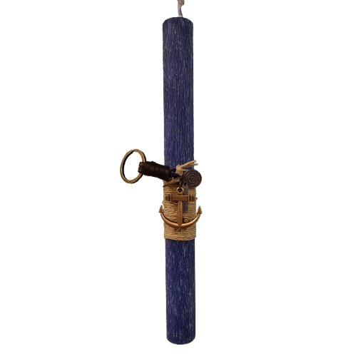 Σαλπάρουμε για την Ανάσταση με την πιο ναυτική και στυλάτη χειροποίητη λαμπάδα! Αυτή η δημιουργία ξεχωρίζει για το σκούρο μπλε κερί της με την ιδιαίτερη ανάγλυφη τεχνοτροπία και το υπέροχο άρωμα που διαρκεί. Το κεντρικό στοιχείο είναι μια εντυπωσιακή μπρούτζινη άγκυρα, η οποία λειτουργεί ως κανονικό μπρελόκ, καθιστώντας τη λαμπάδα ένα εξαιρετικό 2-σε-1 δώρο. Με το δέσιμο από φυσικό σχοινί, είναι η ιδανική επιλογή για εφήβους, άνδρες ή οποιονδήποτε αγαπά τη θάλασσα και τα ταξίδια.