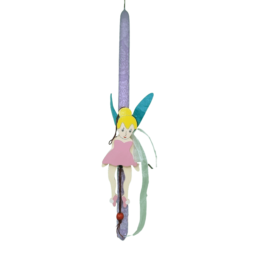 Μια μαγική χειροποίητη πασχαλινή λαμπάδα, ιδανική για τα κορίτσια που αγαπούν τον κόσμο των νεράιδων. Το κερί είναι σε υπέροχη λιλά απόχρωση με ιδιαίτερη τεχνοτροπία, στολισμένο με μια εντυπωσιακή ξύλινη μαριονέτα της αγαπημένης Tinkerbell. Η μαριονέτα διαθέτει κινούμενα μέρη και κρέμεται από διακοσμητικό κορδόνι με κόκκινη χάντρα, ενώ το σύνολο ολοκληρώνεται αρμονικά με μια απαλή πράσινη κορδέλα οργάντζας. Ένα ξεχωριστό και παιχνιδιάρικο δώρο που θα μείνει αξέχαστο!
