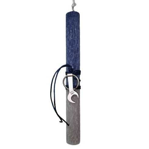 Μια εξαιρετικά πρωτότυπη και χιουμοριστική επιλογή για το Πάσχα, ειδικά αφιερωμένη σε όσους “πιάνουν τα χέρια τους”! Το εντυπωσιακό μεταλλικό μπρελόκ σε σχήμα γαλλικού κλειδιού δίνει έναν βιομηχανικό και έξυπνο χαρακτήρα στη λαμπάδα. Είναι προσεκτικά δεμένη πάνω σε ένα σκούρο, δίχρωμο ανάγλυφο αρωματικό κερί εξαιρετικής ποιότητας, με λιτά κορδόνια που ολοκληρώνουν το απόλυτο δώρο για κάθε μαστροχαλαστή.