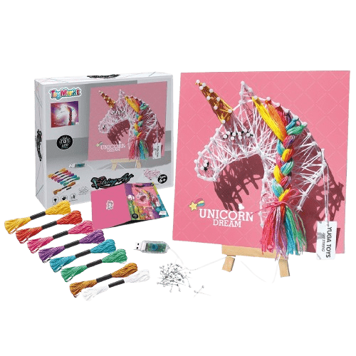 Ανακαλύψτε τη μαγεία της δημιουργίας με αυτό το πρωτότυπο σετ String Art “Unicorn Dream”. Τα παιδιά μπορούν να κατασκευάσουν το δικό τους διακοσμητικό έργο τέχνης, τυλίγοντας πολύχρωμες κλωστές γύρω από καρφίτσες για να σχηματίσουν έναν πανέμορφο μονόκερο. Το αποτέλεσμα γίνεται ακόμα πιο εντυπωσιακό χάρη στον ενσωματωμένο φωτισμό LED, μετατρέποντας την κατασκευή σε ένα μοναδικό φωτιστικό δωματίου. Μια δραστηριότητα που ενισχύει τη συγκέντρωση, τη λεπτή κινητικότητα και την καλλιτεχνική έκφραση.