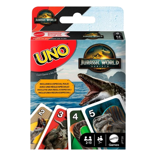 Η επιβίωση του πιο γρήγορου… παίκτη! Το κλασικό και αγαπημένο παιχνίδι καρτών UNO επιστρέφει με άγρια διάθεση, εμπνευσμένο από το Jurassic World Rebirth. Οι κάρτες είναι διακοσμημένες με τους επιβλητικούς δεινοσαύρους, κάνοντας κάθε παρτίδα μια περιπέτεια. Στόχος είναι να ξεφορτωθείτε τις κάρτες σας ταιριάζοντας χρώματα και αριθμούς, αλλά προσέξτε τις “δαγκωματιές” των αντιπάλων! Ιδανικό για βραδιές παιχνιδιού με όλη την οικογένεια.